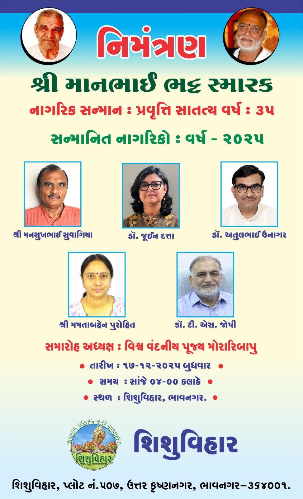 ભાવનગરની અગ્રણ્ય સામાજીક સંસ્થા શિશુવિહારના આદ્ય સ્થાપક અને લોકસેવક માનભાઈ ભટ્ટની પૂણ્યતિથીની સ્મૃતિમાં આવતીકાલે તા.૧૭ મી ડિસેમ્બર ને બુધવારે શિશુવિહારના પટ્ટાંગણમાં સાંજે ૪ કલાકે પરમ આદરણીય પુ.મોરારીબાપુના સાનિધ્યમા ૩૫ મા નાગરિક સન્માન સમારોહનુ રંગદર્શી આયોજન કરવામાં આવેલ છે.